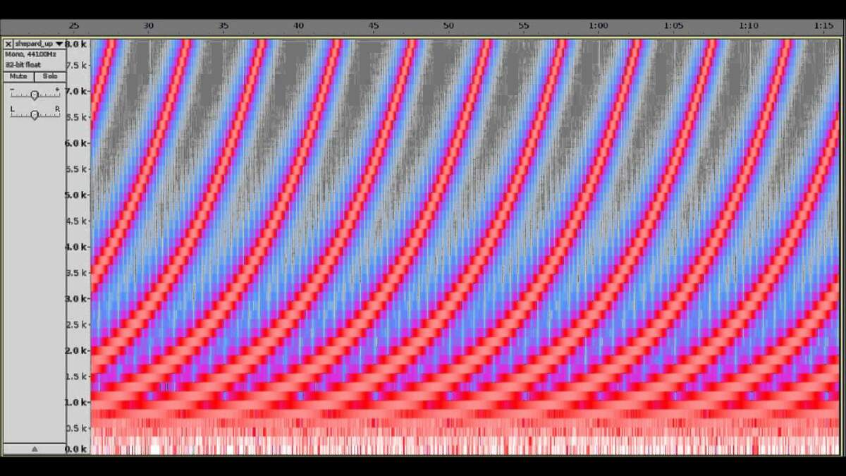 The tone is comprised of multiple scales in different musical voices, i.e. treble, mid-range and bass, separated by one octave a piece. The scales ascend or descend continuously and create the dizzying Shepard tone, which seems to swirl around infinitely with no tonal resolution.