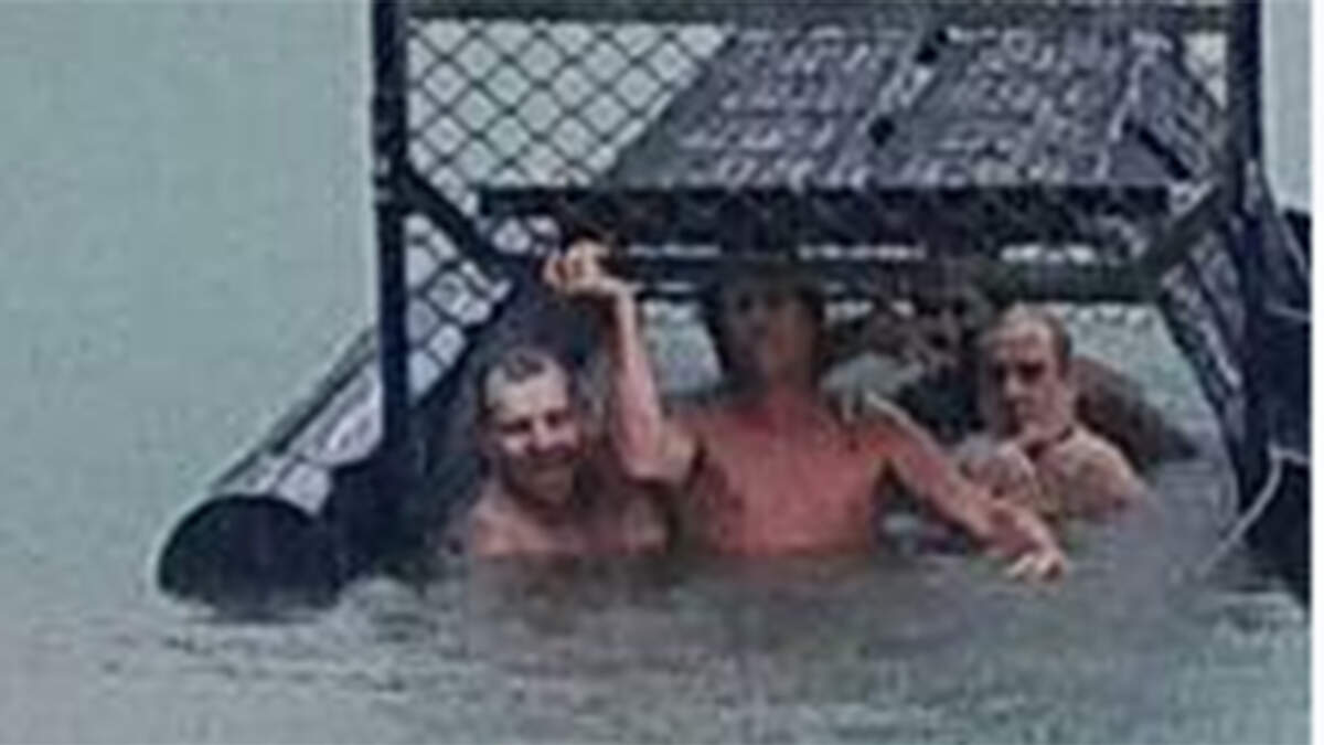 The men were spotted getting into the mouth of the trap at the Port Douglas marina, close to where a crocodile is suspected of killing an elderly dementia patient earlier this month, reports the Guardian.